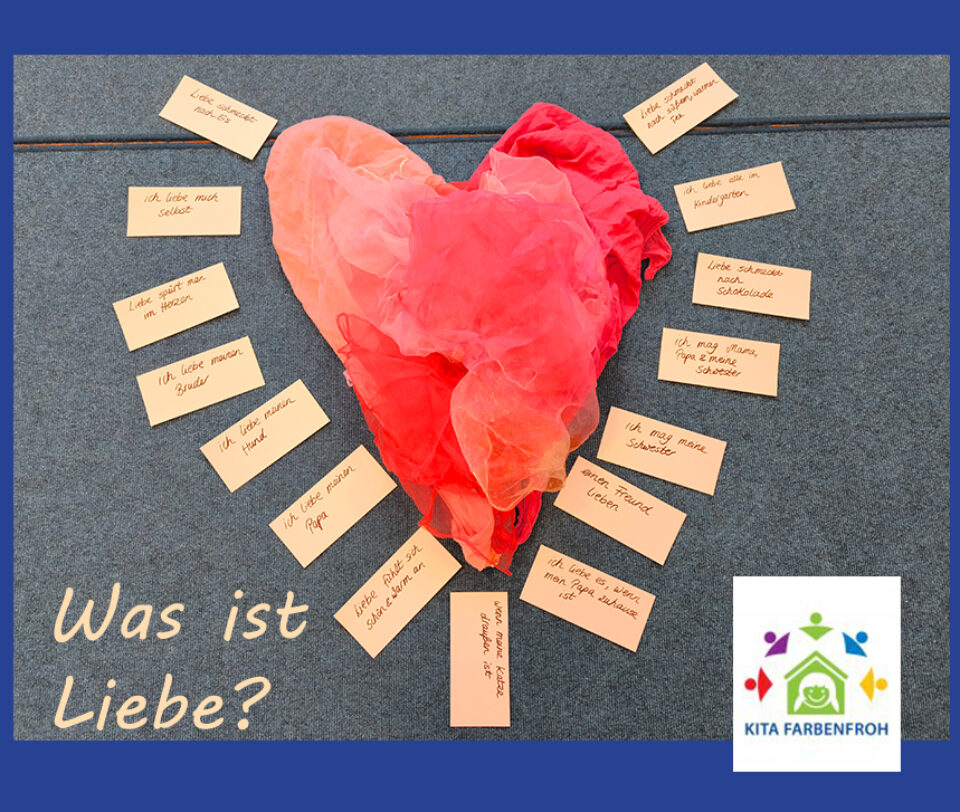 Die Kinder erkennen Liebe nicht nur in Worten, sondern auch in Handlungen. „Liebe ist, wenn man jemanden an die Hand nimmt und auf ihn aufpasst.“ Nicht nur für Familie und Haustiere, sondern auch für Freunde im Kindergarten empfinden die Kinder unserer Kita eine enge Verbundenheit: „Ich liebe meinen Freund.“
